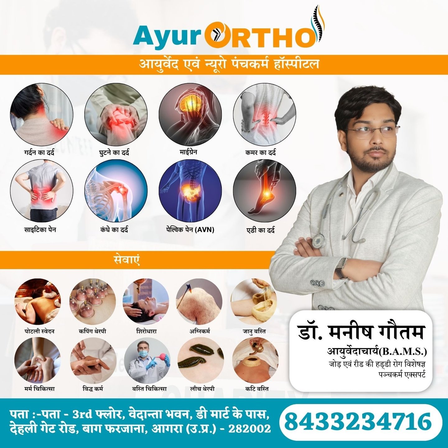 AyurORTHO Ayurveda & Neuro Panchakarma Hospital Agra में पंचकर्म, जोड़ों, स्पाइन, महिला स्वास्थ्य और लाइफस्टाइल डिसऑर्डर के लिए प्राकृतिक आयुर्वेदिक उपचार प्रदान करता है।