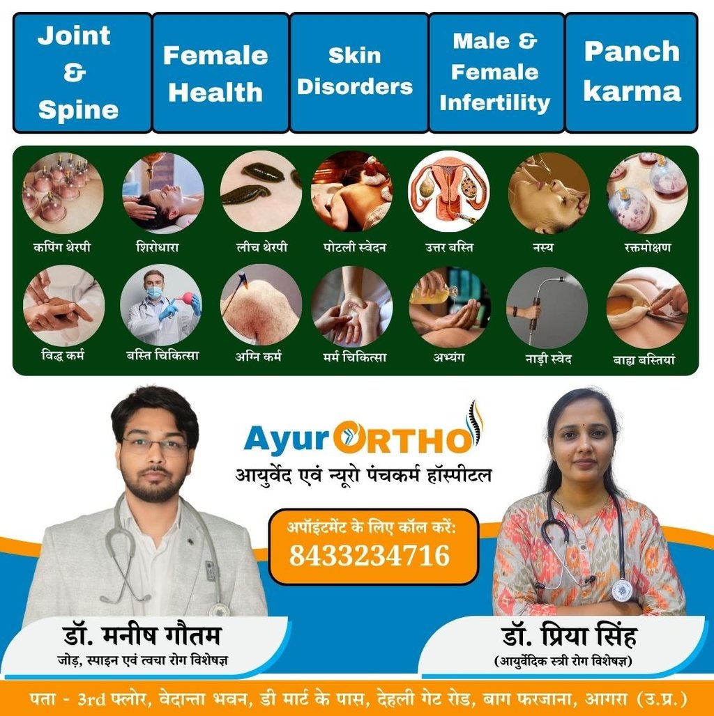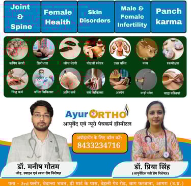 AyurORTHO Ayurveda & Neuro Panchakarma Hospital, Agra में आयुर्वेदिक जीवनशैली और प्राकृतिक उपचार के माध्यम से स्वस्थ जीवन जीने के लिए मार्गदर्शन दिया जाता है। आयुर्वेद अपनाकर हम लंबे समय तक स्वस्थ और सक्रिय रह सकते हैं।